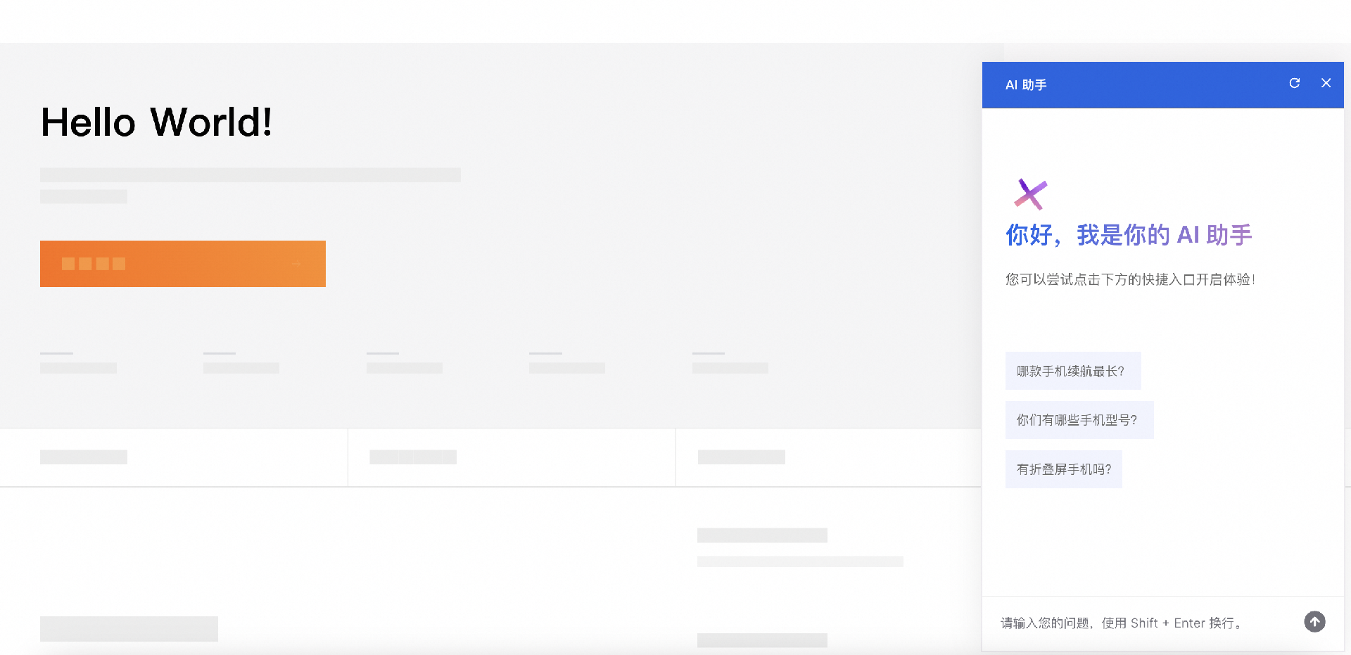 现在,您可以重新访问示例网站页面以查看最新效果。此时您会发现网站的右下角出现了 AI 助手图标